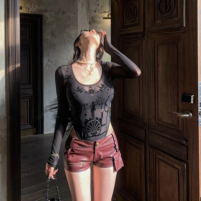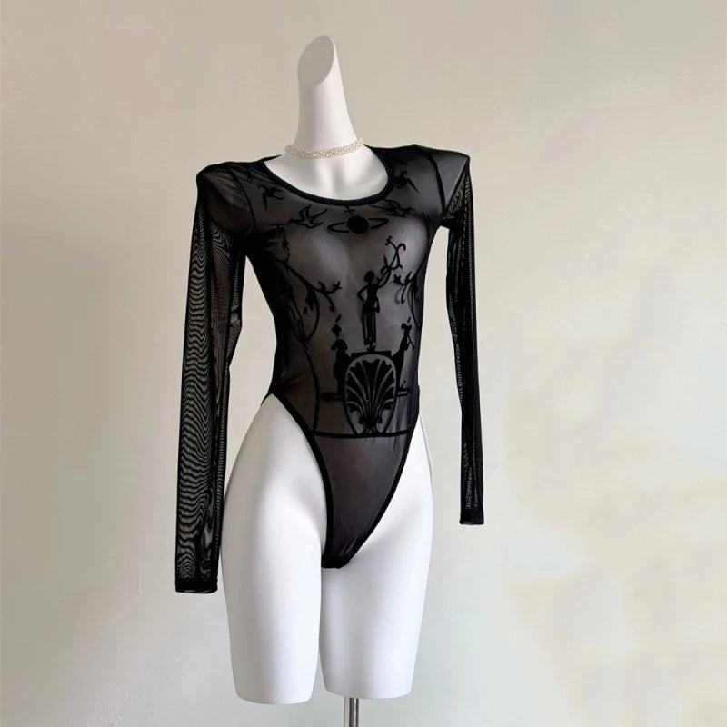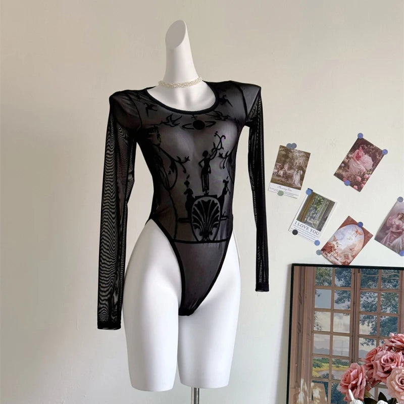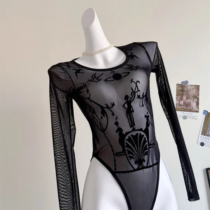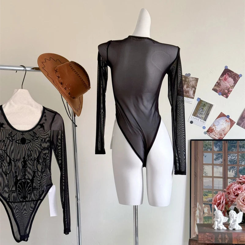 2024 Long Sleeve Black Mesh See Through Sexy Bodycon Bodysuit Spring Summer Women New Outfit Gothic Punk Bodysuits Y2k Clothing