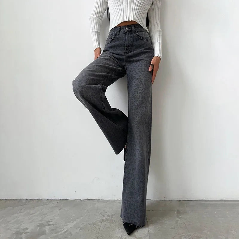 Elegant Grey Leopard Printed Jeans High Waist Straight Leg Vintage High Street Black Jeans Pants Women Formal Korean Retro