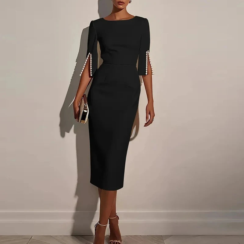 Elegant Women Midi Dress O Neck Half Sleeve Bead Design Party Bodycon Dress Women Fashion Summer Office Dresses Pink White Black